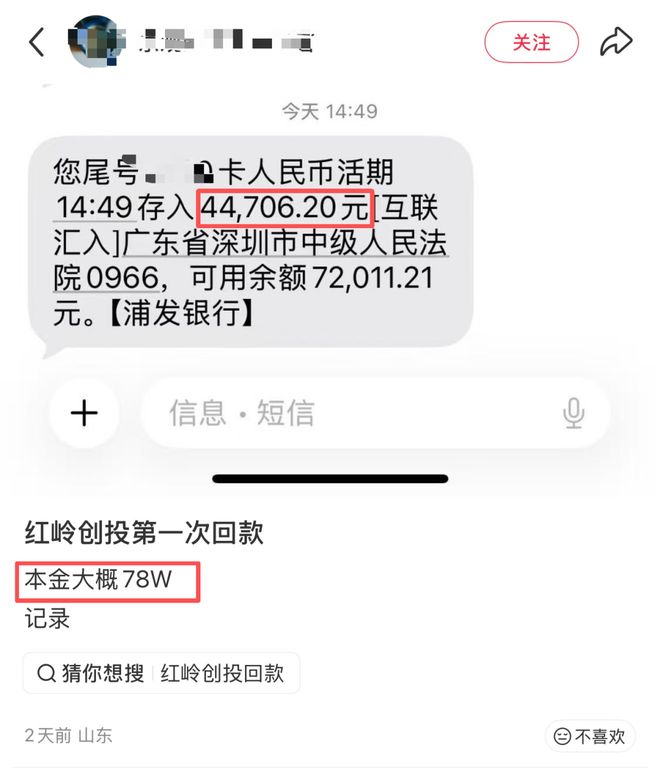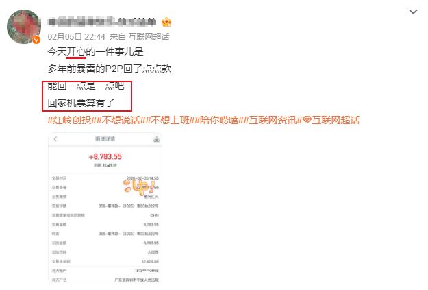 2月2日以来,陆续有投资者在社交平台发帖,称自己收到了广东省深圳市中级人民法院打来“红岭系”旗下平台红岭创投、投资宝的首次退赔款。