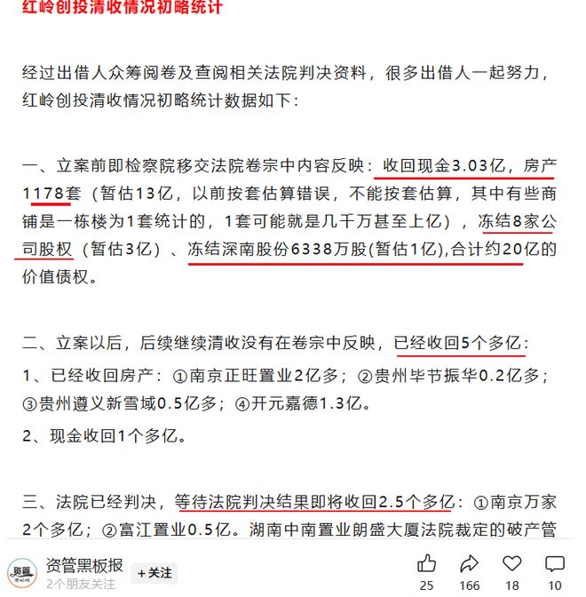 据公众号资管黑板报,经过出借人众筹阅卷及查阅相关法院判决资料粗略统计,立案前移交给法院的卷宗中显示,收回现金3.03亿,房产1178套,冻结8家公司股权,冻结深南股份6338万,合计约20亿价值的债权。立案后,又陆续收回5个多亿,其中包括绝大多数是房产,现金收回1个多亿。法院判决后,也还将收回2.5个多亿。